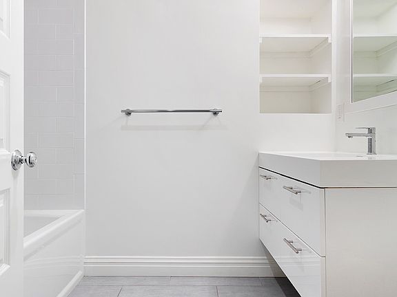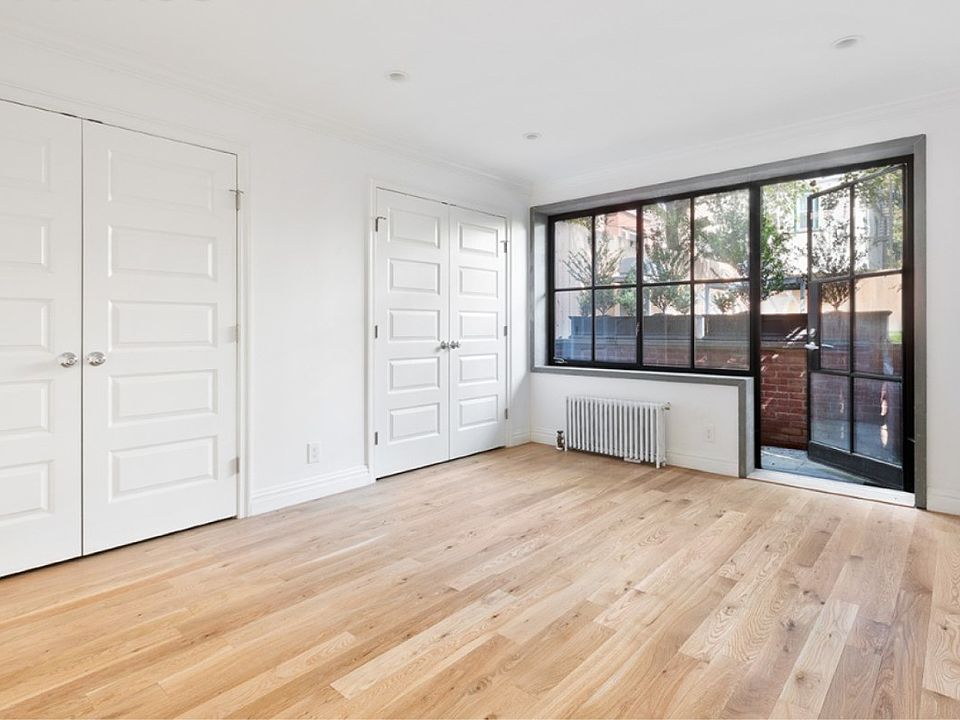 Impeccably finished one-bed, one-bath garden apartment in a charming Clinton Hill row house. Private entrance with long foyer which serves as a perfect landing for coat and shoes storage. Enter into the living/dining area featuring an open kitchen with high end appliances and breakfast bar. Centrally located, large bathroom with deep soaking tub and ample storage. Opposite the bathroom, you have two deeps closets and a third closet containing a full size, stacked washer/dryer. At the back of the home sits a large and serene bedroom with large wall of windows which allow abundant morning light. There is also access to a dedicated patio/terrace just outside your door. The bedroom contains two, massive double-length closets which may just complete all of your storage space needs-if not, there is a small amount of additional storage space available in the basement. Heat/hot water included and the home has central A/C.