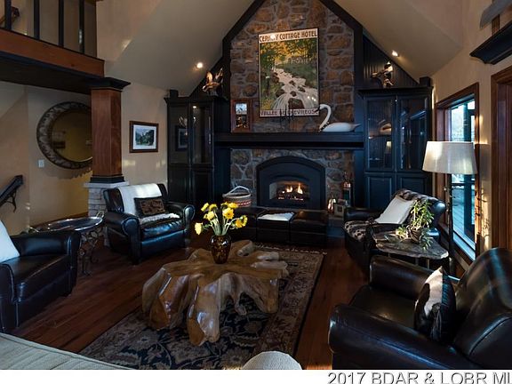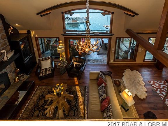 One of the most photographed homes on the Lake of the Ozarks. This exquisite home is situated in prestigious 6 mile cove with 160 of waterfront. Home features 5 bedrooms, 3 of which are master suites, 3 full kitchens and 5 fireplaces. Situated on the main level is one full kitchen, living room with fireplace, Four Seasons room/office, Master suite w/fireplace in bath plus a large screened deck w/another fireplace. Upper level features 2 bedroom suites. Another full kitchen/bar, 2 bedrooms, family room w/fireplace are on the lower level and lead out to another impressive deck w/an outdoor kitchen. 3 well dock w/swim platform and an additional PWC slip is included. Be sure to watch the amazing video to get a full tour of the home.