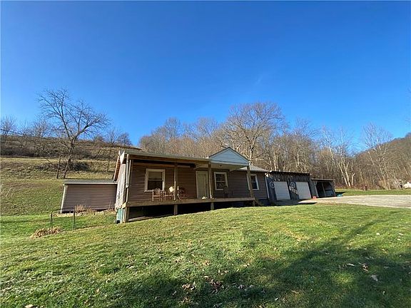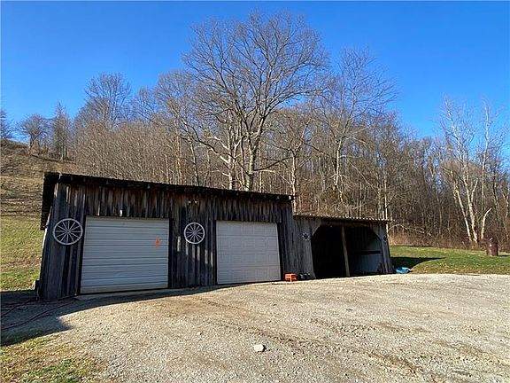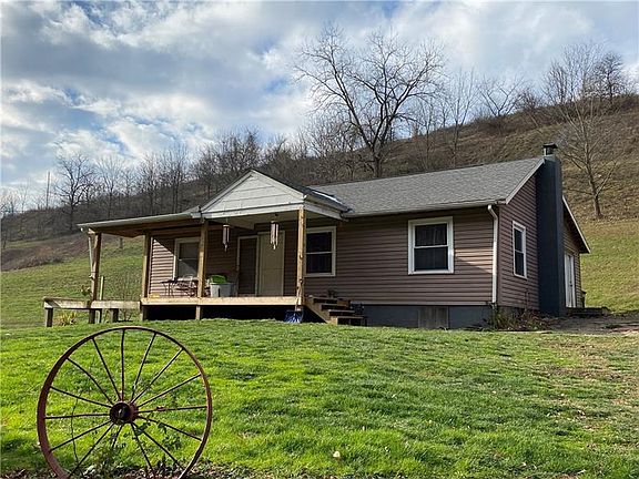 QUAINT RANCH HOME IN COUNTRY LOCATION W/SPLENDID PRIVACY is surrounded by 4.6 acres! Lovely newer solid oak wood kitchen cabinetry w/tons of space w/newer laminate flooring, sunny open dining room w/french doors out to side porch, large living room w/hardwood oak floors, & built-in bookcase, spacious laundry room on main level, updated bath, 3 spacious bedrooms, master bedroom w/huge-walk-in closet (which could be another bedroom if needed), open floor plan, full basement w/walk out door, whole house wood-burner as second heat source, watch all the wildlife from your front covered porch! 2 car detached garage w/electricity and water, a large lean to against the garage-for lawn equipment, four wheelers, recreational vehicles, another huge newer barn(2017)-for large tractors & hay storage, High tensile fencing-bring the horses! Land goes across road to other side of road too. Newer roof (2018), new coyote system for well, newer hot water tank, another separate storage building too!