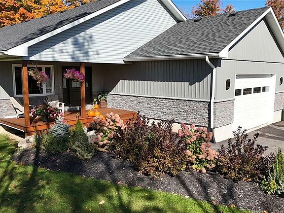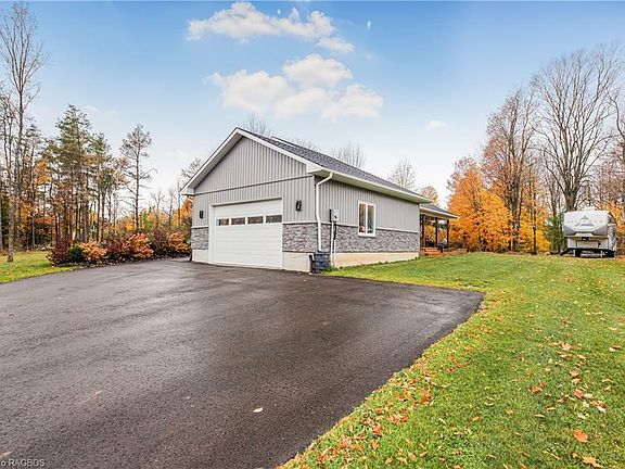 Welcome to this beautifully crafted raised bungalow, built in 2021, featuring a modern design with vaulted ceilings. The main floor has a spacious open-concept layout, combining the kitchen and living area seamlessly. The kitchen offers plenty of storage, including a large pantry and and stunning engineered hardwood floors throughout. The home includes three generously sized bedrooms and three bathrooms, with the master suite being a true retreat. It features a large ensuite bathroom, private sliding doors lead directly to the deck, and there is also plumbing roughed in to add a jacuzzi tub. Two propane fireplaces can be found in this home to add warmth and ambiance, one on each floor, while both of them placed against beautiful stonework. Downstairs, the fully finished basement offers a massive rec room, two of the bedrooms, and a full bathroom. You can also find a 22x25 ft garage that leads into a huge mud room for plenty more storage. Outside, the property includes a 10x20 shed, a well maintained yard, an asphalt driveway completed in 2024, and a hydro hook up for a camper.