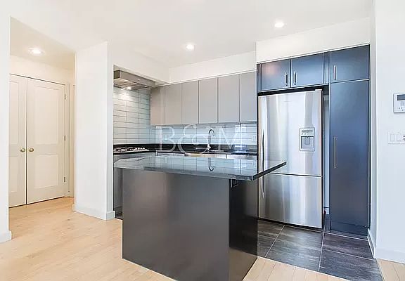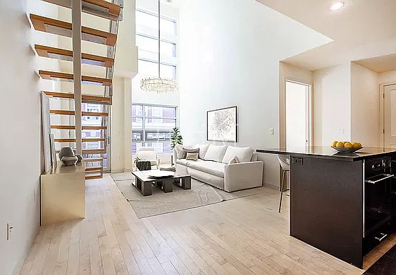 The 18 foot ceiling, and an interesting pattern of windows climbing up it are the first things you'll notice when entering condo 3a. The living-dining area has a lot of size to it, and an attractive appearance with floating stairs & wood ceiling fan. On the main level is - a balcony - livingroom with a nook & television mount - kitchen with plenty of storage and island - closet with storage and washer/dryer - full bathroom with tub - large bedroom with two sizable closets. Up the stairs is the same sized bedroom, bathroom layout with a large mezzanine leading to them. There are a few things that really make this property stand out. Both bedrooms are large enough for king sized beds, and they both have a Lot of closet space; an uncommon find. The mezzanine is a nice bonus, a great space for desks, a guest bed, artwork or musical instruments, etc. As there are two large vestibule entryways one can be used as an in-home storage unit ... a large one at that. Interior design elements include: stainless steel Fisher & Paykel Refrigerator, Whirlpool ovens and dishwashers, DeLonge cooktops, black granite countertops, and modern stainless European-style cabinetry. Bathrooms are both full size, featuring olive-brown European porcelain floor tiles, porcelain wall tiles, Kohler vanities, & Kohler deep soaking tubs. The home is cooled and heated with Central Air, controlled by Ecobee system with sensors. When you step out of the condo its a couple flights up to a shared, furnished rooftop, or a couple blocks to plenty of restaurants, shops, and the Graham L train.