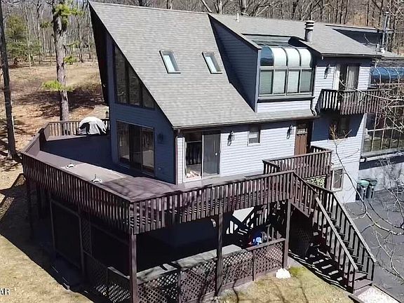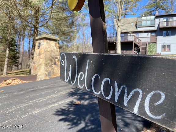 TANGLWOOD NORTH - UNIQUE CUSTOM MOUNTAIN RETREAT MASTERPIECE with tons of CHARACTER. Home features include: 4 beds, 3 baths, Open Floor Plan, Huge Cathedral Great Room/Atrium, Hardwood & Slate Floors, Multiple Fireplaces, Custom Stone Work, Knotty Pine Ceilings, Cathedral Living Room w/ Loft, Skylights, Andersen Windows & Doors, Master Suite w/ 5 Piece Bath & Double Sided Fireplace & Juliet Porch, 2 Car Garage, Full Finished Basement, Loads of Closet & Storage Space, Forced Air Propane Heat (easy to add A/C), Huge Party Deck, Paved Wrap-Around Driveway, Sunset Views and a Lot More. This home was built to ENTERTAIN! All set on a 1.03 Acre Double Lot at end of Cul-De-Sac that backs up to community Green Space that has Lake Wallenpaupack Views. Deeded Lake Rights to Lake Wallenpaupack and