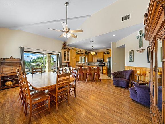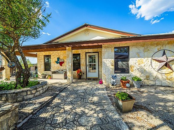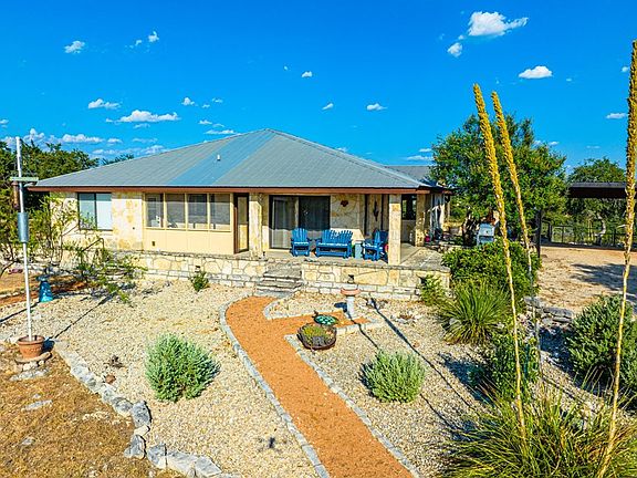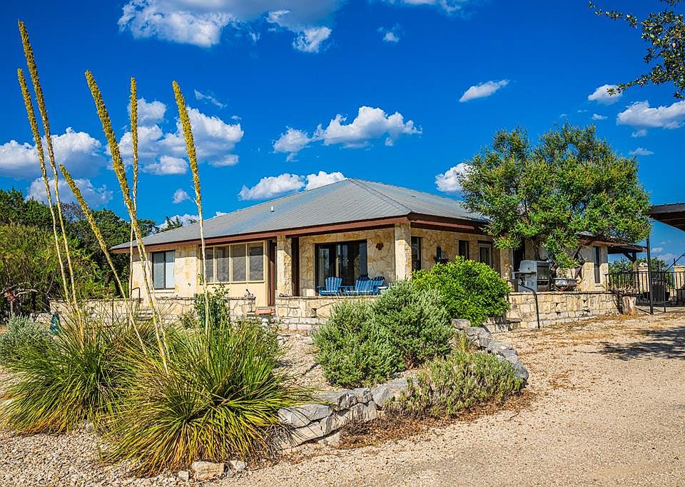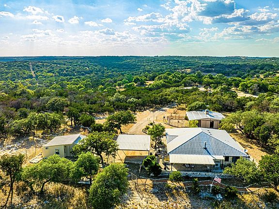 Welcome to the secluded, Hill Country homesteading oasis you've been waiting for! This incredibly well-maintained rock home sits on 9.99 rolling acres, fully fenced, with plentiful oak trees & stunning VIEWS! The refreshing breeze instantly graces you when approaching the massive, fully rocked wrap around porch. A lovely 2 bed, 2 bath awaits inside with pine wood & stone accents, high ceilings, granite counter tops, stainless appliances, & large den/living area. Beside the home sits a 600 sq.ft. guest cottage or potential rental with full bathroom & bunks to accommodate the whole family. Powering the property during the day is the solar panel covered roof over the workshop & stables, an incredible bonus feature! The 4 stable barn has concrete floors, loafing areas, & chicken coop. Run on a water well, the property also has a thriving garden, plumbed & fenced. Other updates to the house include NEW A/C unit with air sanitation feature, new hot water heater, bathroom vanities, kitchen island & appliances, & extensive land clearing plus rock clean up. Take in a breath of fresh air, relax on the covered back porch & experience the perfect getaway amongst the hills for yourself!