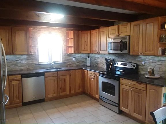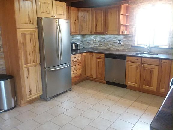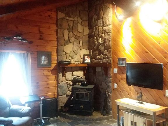Tastefully remodeled log raised Ranch home. Main floor full log surround design. High vaulted knotty Pine living room ceiling with wood/coal stove, newer Hickory cabinet kitchen w/granite counters and ceramic backsplash. Lower level family room w/concrete bar and 2nd wood stove, 1/2 bath, laundry room, large wrap around deck w/front screened porch. A must see!
