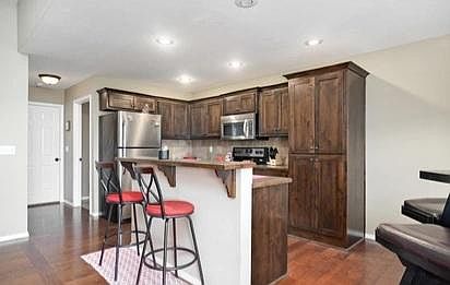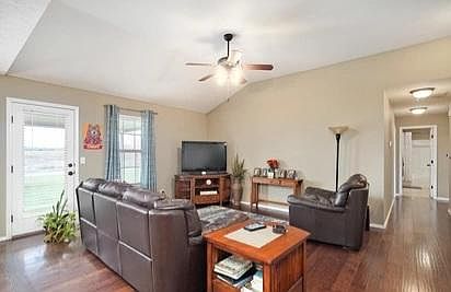 Attractively detailed home with a contemporary and open Kitchen/Dining design has a large center island with custom cabinetry and bar stool seating open to the Living Room with vaulted ceiling and hand scraped look wood flooring throughout. Master Bed with Master Bath has dual sinks and walk-in closets with a walk-in shower. Home has a large Patio space (covered & uncovered) and backs to beautiful pastureland. Quick access to Hwy 60.