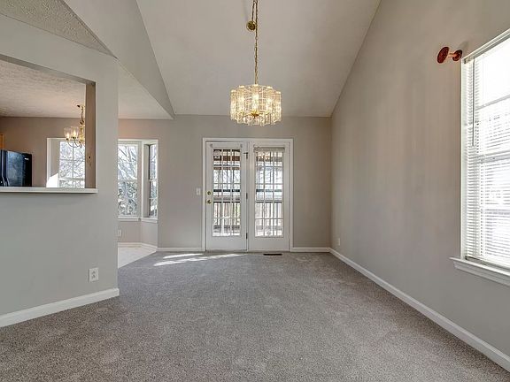 Bright living room featuring vaulted ceilings and a cozy corner fireplace