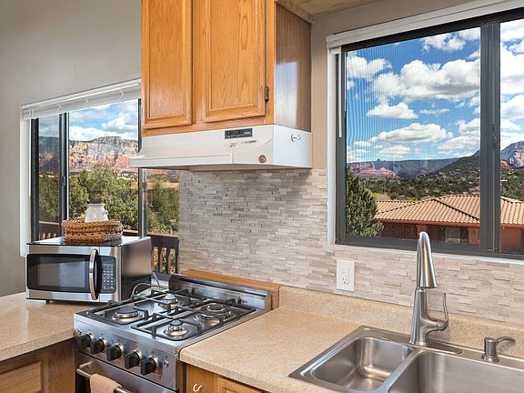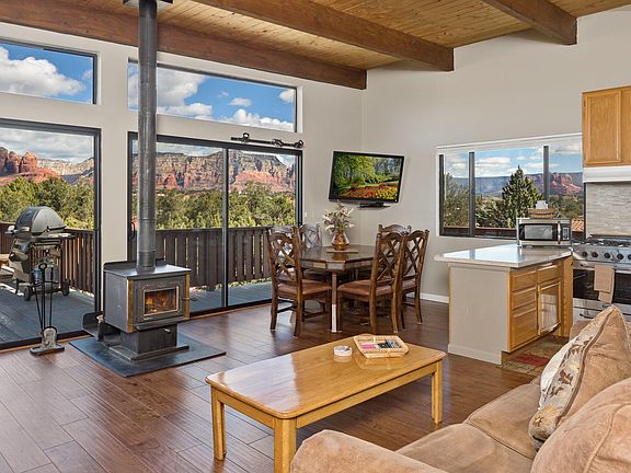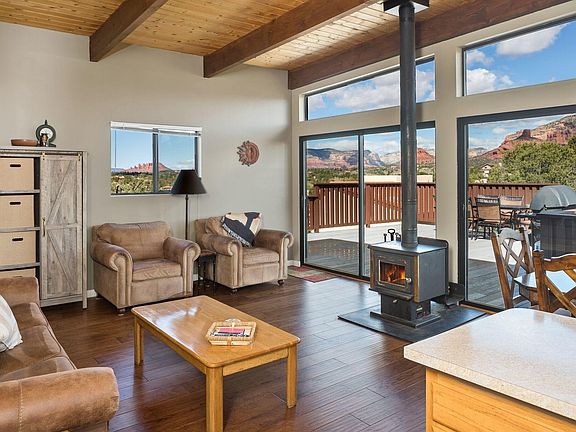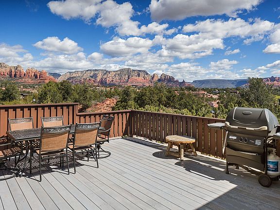 Newly remodeled showcase home offering hands down the best red rock views in this neighborhood and price range. Situated on the top of the hill for unblockable views, this home offers an upper deck treehouse lifestyle with massive walk out deck to bask in the daytime sun or to star watch at night after a day wandering the nearby National Forest trail system. Lower level entry has a living room, two bedrooms and a full bath, and the upstairs kitchen and dining room offer the WOW views we're all searching for. Tear yourself away from the Thunder Mountain views to see the master bedroom with full bath with views of Airport Mesa and the Carol Canyon trail system just 200 yards away. Perfect West Sedona location for a primary residence or AirBnB! No HOA