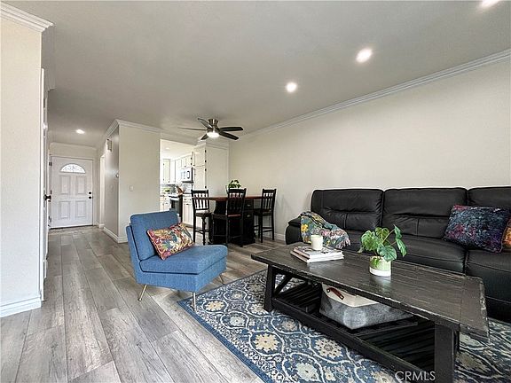 Beautifully updated end unit condo in the highly desirable Broadmoor Community! This turkey townhome style condo offers 2 Large bedrooms and 1-1/2 bathrooms with a spacious patio overlooking the greenbelt, adding a sense of extra privacy. The kitchen has been thoroughly upgraded and opened showcasing white shaker cabinets, stainless steal appliances and allowing it to flow seamlessly into the dining area. Other features include updated bathrooms, recessed lighting, Vinyl floors, central AC, and ceiling fans in each room. This condo comes with a one car garage. The community is conveniently located near shopping and restaurants, with easy access to major highways, such as the 57, 55, and 91.