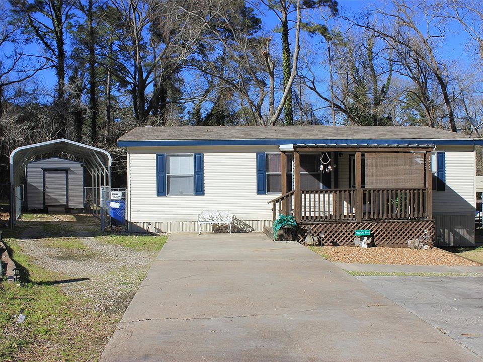3 bedroom 2 bath 1120 Sq. Ft. of living area sitting on 7,360 Sq. Ft. in Kickapoo Forest ! This lake front subdivision offers a boat ramp , park, meeting center, pier , and much more ! upgrades to the yard include 2 1/2 ft. bulk headed yard on all sides with no wash out , a covered parking carport 15*20 and a storage building with electric ! This property also offers a covered front porch and large wood sitting deck in the back yard ! through the front door you enter the Livingroom directly behind the Livingroom is located the kitchen with the utility room to the right of the kitchen ! Primary bedroom is to the right of the Livingroom followed by the primary bath the other 2 guest rooms and bathroom is to the left of the Livingroom there is also a office behind the laundry room followed by a screened in sitting area ! There is an electric RV hookup on the right side !An adventure and fishing awaits buying this home on the 2nd largest lake in Texas Lake Livingston !