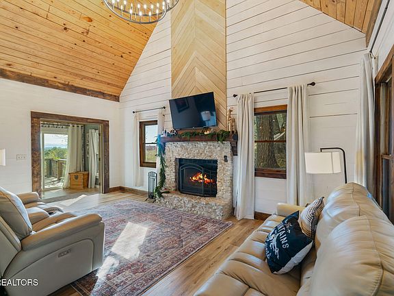 MOTIVATED SELLERS - BRING ALL OFFERS! Sellers offering $5,000 in concessions buyer can use toward closing costs or rate buy-downs with accepted offer! Sellers are being relocated and must sell. Welcome to your newly renovated turnkey & fully furnished mountain retreat on 1.73 acres with mountain views! This 3 bedroom, 2 bath cabin plus a 1-bedroom tiny home offers the perfect blend of rustic charm and modern convenience. Enjoy your fall mornings with coffee on the porch swing and spend your evenings entertaining on the 900 sq. ft. wrap around deck with new 6-person hot tub/spa! Step inside to the living room with soaring cathedral ceilings, a cozy wood-burning fireplace, and a light-filled living area. The primary bedroom is on the main, along with a full bath, kitchen and dining area, and flex room with bunk beds. Upstairs is an additional fully renovated bedroom and full bathroom.