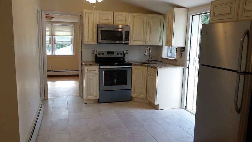 Everything has been redone in this 3 bedroom, 1 bathroom cozy apartment. There are lots of windows letting in natural light. Beautiful original yellow pine hardwood floors have just been refinished in all 3 bedrooms, living room and hallway. New porcelain tile floors in the bathroom and kitchen, no carpet anywhere. Bright open kitchen with vaulted ceiling, featuring new stainless steel appliances, granite countertop, and new solid wood cabinets. Bathroom has all new appliances/fixtures. Brand new washer/dryer in unit! Bedrooms and living room have new ceiling fans installed. Extra storage space in the large eaves/closets. New large deck off the main entrance for outdoor lounging. Large yard with plenty of driveway parking in a nice, quiet neighborhood. Walking distance to public transit, stores, and restaurants. Landlord responsible for lawn and snow removal. Tenant responsible for gas and electric. Water/sewer is an additional $30 per month.