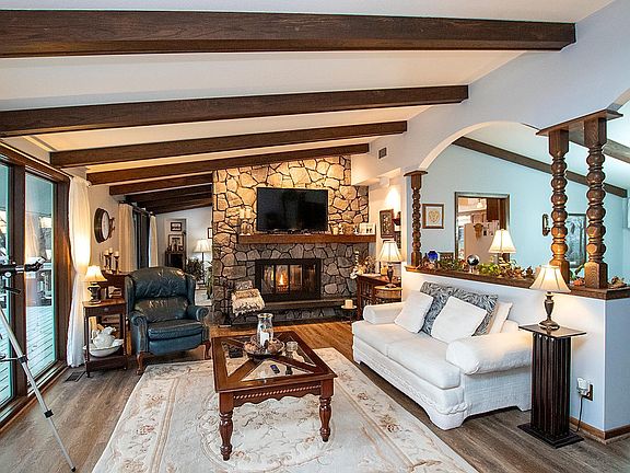 Stunning, level lakefront property with 185 feet of sandy beach on Winsted Lake. Circular driveway has a front entrance carport with electricity and beautifully hand-carved front doors. 4 bedrooms (including a primary with en suite and changing room), 3.25 bathrooms, see-through double sided fireplace on main level, kitchen has granite counters and built in state of the art oven and microwave/convection, 2 sets of stairs leading to the finished walkout lower level which includes a family room, kitchenette style room w/ cupboards and countertops, cedar closet for storage, fitness center, 8 person sauna and shower. Updated furnace and A/C with multiple zone heating and cooling, whole house central vacuum system, and automatic closet light system. Newer roof, new windows, gutter leaf guards, new chimney & lining with new fireplace insert, underground sprinkling (lake water drawn), and firepit. 6 stall garage includes 3 street level stalls with hot & cold water, insulated, garage attic and 3 lower "tuck under" stalls (both levels have floor drainage). Enjoy relaxing views from the lakeside deck and patio. Water fowl and Bird lovers dream! (swans, pelicans, geese, eagles, wood ducks, & many other species). This property boasts Pride of Ownership!