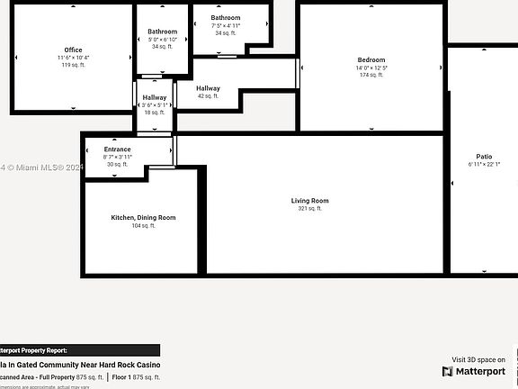 Just reduced! See Matterport virtual tour. Near the Hard Rock Casino, this unit features complete hurricane protection and a spacious kitchen with some new appliances! Freshly painted and updated with new microwave oven, stunning quartz kitchen counter and updated electrical outlets, this unit is ready for moving in and enjoying. This is especially comfortable if you work from home as the second bedroom is roomy with a large closet. There is plenty of room for storage. The fully enclosed back patio stretches the entire width of the property offering 150+ sf more living area than the county rolls show. The front has a private fenced patio where you can enjoy the sunshine. The association takes care of outside painting, including the fence. Secure entry is via gate with phone.