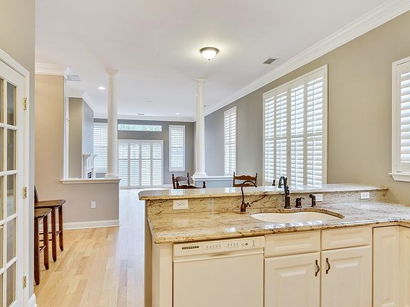 Beautiful stone-front Sanibel model is situated on a prime, oversized corner lot backing to woods, enhanced by water view. Pristine, freshly painted, upgraded 3 bed, 2 bath home features leaded glass door, newly re?nished Mirage hardwood ?ooring, custom moldings in LR and DR, 10 ft. ceilings and crown molding throughout, recessed lighting, gourmet kitchen w/ 42'' cabinets, granite counters and peninsula, pantry w/ French doors, extended Master Bedroom suite w/ bay window and walk-in closet, upgraded baths, FR w/gas ?replace and built-ins, plantation shutters, sliders lead to paver-patio w/arbor in garden w/private wooded backdrop. Extended garage w/bonus room above for storage. Window treatments and appliances are included. Immaculate, spacious home! Must see!