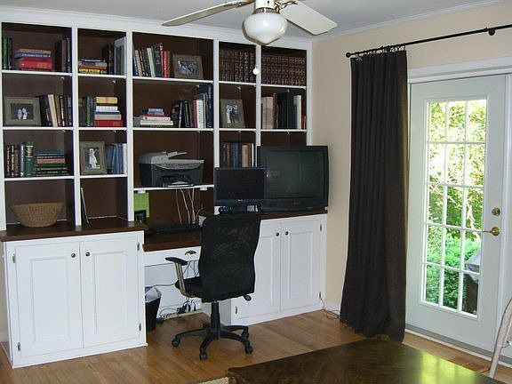 - Fireplace, Window Blinds, Built-ins, Ceiling Fan, Window Treatments