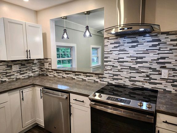 Beautiful, modern, completely renovated, 3 bedroom home, on a large level lot in Rutland City. This home offers a spacious open concept full of natural light. The brand new dream kitchen includes shaker cabinets, gorgeous quartz countertop, all new GE appliances, including a built-in microwave, modern farmhouse sink, plenty of cabinet space and a pantry along with a beautiful pass through with a quartz countertop bar that opens up into the dining room. The kitchen opens up to the spacious living room with a huge new window. There’s a bonus room that would make a perfect home office. The completely new bathroom is a real eye catcher with gorgeous tile, full size tub/shower combo and plenty of storage space. This renovated home includes all new electrical wiring including breaker box, a new roof, new vinyl siding, windows, insulation, fixtures, drywall, flooring, as well as landscaping. There is a new 7x16 covered deck that goes out into the backyard and patio area. All on a one way street, quiet neighborhood in the Northeast School District, and fifteen minutes to Killington. Single level living at its finest, nothing to do but relax and enjoy, Welcome Home!