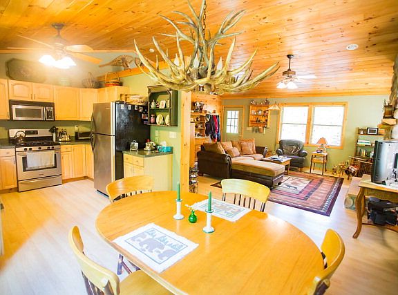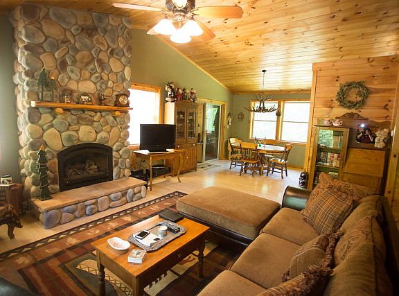 Close to town yet nestled in the woods, this beautifully maintained 2 bed, 2 bath home has the perfect balance of privacy and convenience. An open floor plan and stone fireplace create an inviting atmosphere. Additional sunroom with wood burning fireplace is a cozy place to unwind. Heated one stall garage with built in murphy bed offers additional room for guests or space for your toys/car. Large shed with workbench and wooded backyard with patio all add up to year round enjoyment. Deeded lake rights to Hollywood Hills beach and close to snowmobile trails.