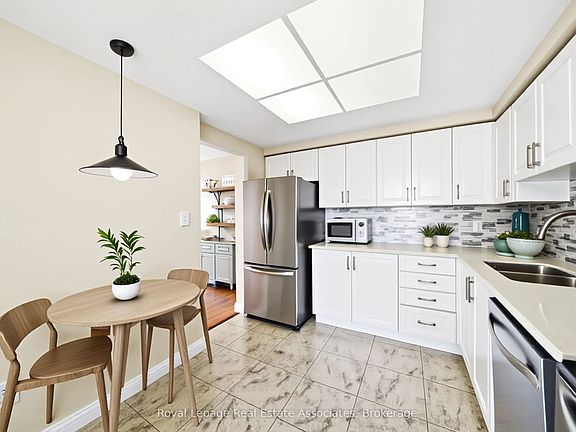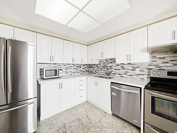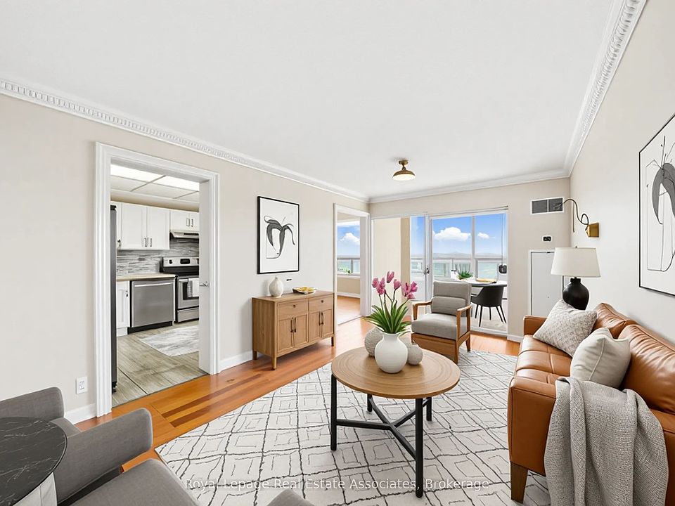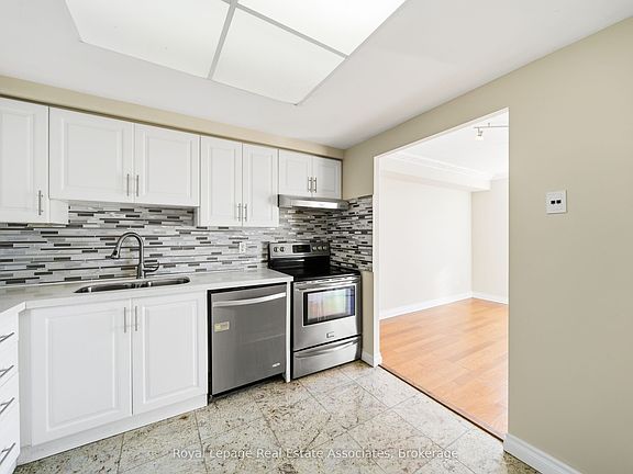 Welcome to this beautifully designed, freshly painted, large 1 bedroom + solarium + separate dining room condo offering incredible natural light and breathtaking southwest facing views. This 844 sq ft open-concept gem features, crown moulding, a versatile sun-drenched solarium ideal as a home office, flex space, or playroom. Enjoy a spacious primary bedroom with a large walk-in closet, ensuite laundry, hardwood flooring, and stainless-steel appliances in a tastefully renovated kitchen. With one parking space included, this move-in-ready unit is ideal for professionals, couples, or small families. Perfectly located just steps from Cooksville GO Station, top-rated schools, and minutes from Square One, offering every convenience of vibrant Mississauga living. The building also offers 24-hour security, a gym, squash/tennis courts, and ample visitor parking. ( Some photos have been virtually staged )