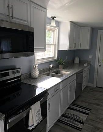 Beautifully renovated home with 3 bedrooms and 1 bath. Open floor plan from kitchen to living room. New kitchen with cabinets, granite and SS appliances. All new bathroom. New flooring throughout - tile in kitchen and bathroom, hardwood in living room and laminate in halls and bedrooms. Freshly painted inside and out. Very clean and fresh. New plumbing and garage door. Large yard in the front and side and private back yard. Easy access to the highways. Move in condition. Will not last.