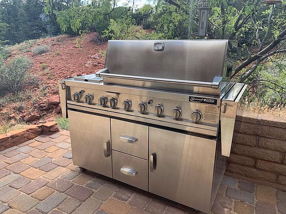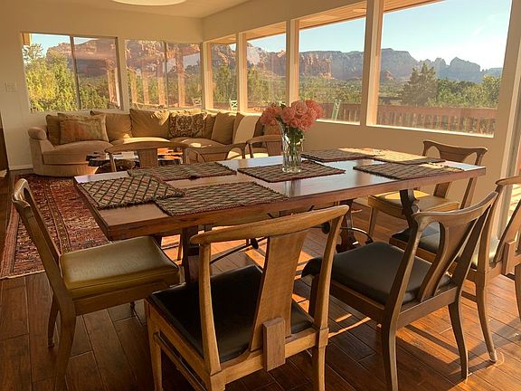 Majestic Red Rock Formations surround this Custom 4 bedroom 4 bath home. This 3000 square foot tastefully designed home is centrally located in West Sedona hosts 4 bedroom with 4 bathrooms, incredible views, tranquil, yet close to all Sedona offers Relax in the living area or walk out on one of the decks and experience the spectacular views as you listen to the breezes whispering through the Juniper and Pine trees, in this home nestled amid the beauty of the Red-Rocks of Sedona. Yes, all the photos are taken from the home. The level of luxury is undeniably impressive, the location, world-class. This private, custom contemporary meets rustic Sedona is a rare offering. This four bedroom, four bath plus sitting room home and a laundry room commands unparalleled panoramic views of the World Famous red rocks of Sedona and the surrounding natural native beauty. Beautifully designed with high quality materials, the home delivers a spectacular Sedona experience. The large and comfortable spaces are richly detailed with Native American rugs and art, Living Edge woods, custom designed tilework, natural stone counters, and custom lighting. A large hand crafted red rock wood burning fireplace keeps you cozy in the main living area filled with comfortable high end furnishings. Large windows and doors open to outdoor spaces and also bathe the indoors with natural light. Inside or out, you gaze upon Sedona's Red Rocks from every direction. Enjoy world class views from the wrap around decks and several outdoor dining and lounging areas including an outdoor fire pit surrounded by comfortable patio furnishings. Sit back and enjoy the night skies and falling stars after the setting sun lights up the rock formations to a fiery gold, the photo in the listing is a great example of the sunset views. The large open gourmet kitchen with red rock and desert views has top of the line stainless steel appliances. The kitchen is stocked with everything you need to prepare your afternoon appetizers or any meal you decide to enjoy at home. If you prefer to BBQ there is a natural gas BBQ for your convenience. Experience an incredible night's sleep in the master bedroom on a Cal King bed. Enhance your experience in the master bathroom in the large and beautifully styled porcelain & glass shower. Custom designed wood work cabinetry, large mirrors and glass onyx tile complete this beautifully appointed bathroom. The second bedroom has two plush queen beds, a large dual vanity bathroom with two dressing areas and a full bathtub and shower. This bedroom offers serenity, red rock and nature's views. Every bed is adorned with 100% luxury cotton sheets with top of the line mattresses and bedding. Enjoy luxury bath amenities in every one of the four bathrooms of this quality home. Step back in time to the lower level Hacienda. The downstairs master, with a full bathroom and two separate entries is a unique experience. Sleep on a stately Cal King bed, relax in the leather sling chairs or the vintage wood and leather bistro chairs & table, a kitchenette complete with a stainless wine & mini fridge and Keruig and Nespresso machines. The second downstairs bedroom has a rich and cozy feel with a queen bed. The adjacent sitting room with a large sectional and a stone and copper wall make it the perfect place to relax and read in a quiet indoor setting. You can steep a cup of tea, brew some coffee, or pour a glass of wine, then step out and relax on the many beautiful outdoor sitting areas with gorgeous views of the surrounding mountains and rock formations. Meander through the naturally landscaped yard and enjoy the tranquility of Sedona without ever leaving the property. The home's proximity is central to all Sedona has to offer. Nearby hiking trails, grocery stores and fine restaurants for take out are all very close, many no more than a mile away. Owner pays for trash and water. Tenant pays gas, electric and internet/cable.