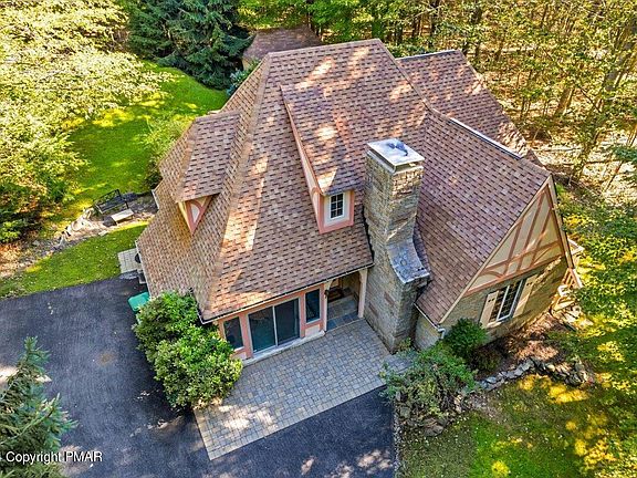 Lakeview Fairy-Tale Tudor Style Home in the welcoming Lake in the Clouds community in the heart of the Poconos. Perfect Weekend Retreat or Year-Round home with a Peaceful and Serene Setting. This Custom-Built & Lovingly maintained home is offered Furnished and is MOVE-IN Ready. 3 spacious bedrooms, 2 full baths, Sunlight-filled 4 Season room with a Cozy Pellet Stove. Open Concept Living with Soaring TIMBER frame beams in the Living Room with a Massive Stone Fireplace with efficient Pellet stove insert. FIRST FLOOR bedroom with its own PRIVATE DECK. Outdoor Shed/Workshop. Relax on the large deck or enjoy the amenities that this thriving lake community has to offer: 3 LAKES FOR FISHING. Rowboat or Electric Power Boating, Beach, Pavilion, Clubhouse, Volleyball, Playground, Tennis Courts & Path to Lookout Point with a VIEW! Quiet with no Short-Term Rentals.