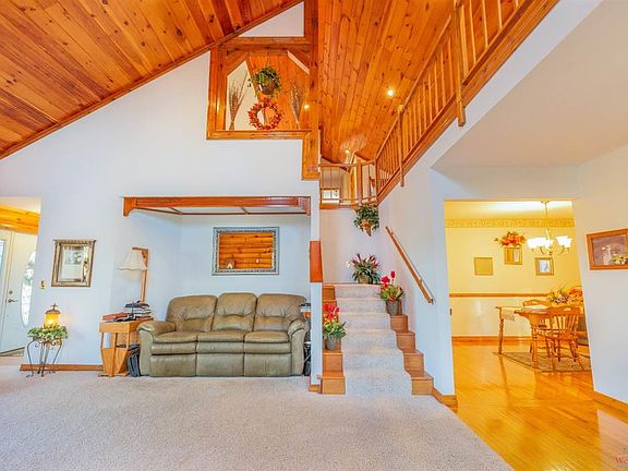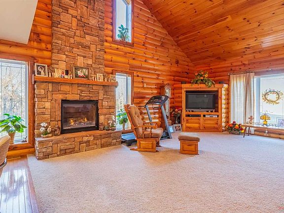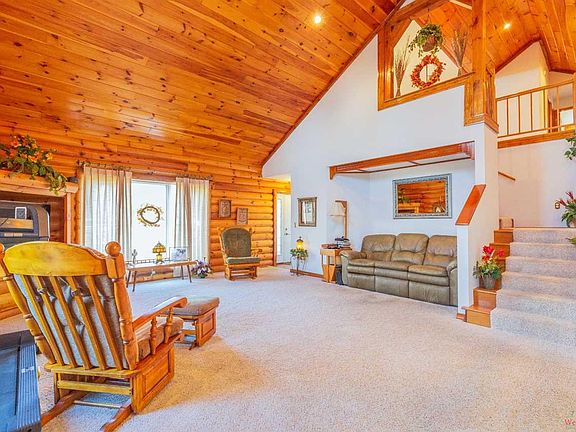 If you love Beautiful Log Homes with a little acreage and lots of garage space, look no further. This home features the most gorgeous open concept in the world. The owner built it to perfection. Walk on to the Red wood front porch, to a huge living room with a built in gas fireplace, cathedral ceiling, built-ins that you will go crazy over. Kitchen features Oak custom built cabinets, pull out drawers in pantry and opened up to the living room. Dining room is a dream. Off the dining room is a sun room that has a hot tub for relaxation and beautiful windows to look out to the backyard so you can see wildlife. Main bathroom has a step up jet tub and shower. Laundry room is right off the attached garage and next to full bathroom. Go upstairs onto a huge sitting area that overlooks the living room, kitchen and across to the lake that you will have fishing rights to. The bedrooms upstairs are very spacious along with a full bathroom to share for privacy. A huge closet can be shared by both bedrooms. The detached garage features a 38x14 space for a camper, 32x52 workshop and extra inside parking with electrical and concrete flooring. Backside of garage has room to put tractor, lawn mower and lawn supplies. This is a must see and you won't want to pass it up!!!!!