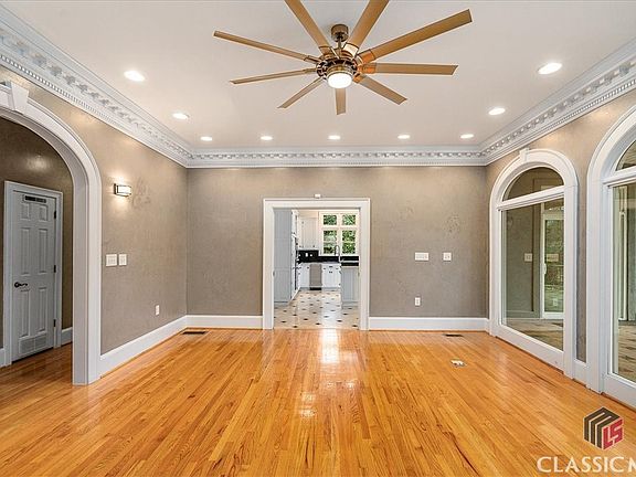 Step into the grand foyer, which is flooded with natural light and adorned with travertine marble floor, curved staircase, and 12' custom chandelier. A beautiful archway leads your eye through the family room to the back of the house with a peek of the knock-your-socks-off landscaping. Another archway takes you into the living room, with its hardwood floors, extensive millwork, large windows, and pocket doors that lead to the dining room. The dining room is large enough for a banquet sized table and showcases extensive molding, hardwood floors, built in display shelves, and bay window.