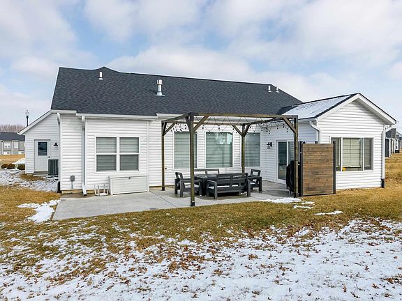 Why take the time to build when you can move directly into this like new zero entry 4 bedroom ranch that offers many upgrades including a curb cut driveway, extra exterior faucets and custom blinds. From the oversized 3-car heated garage with added hot water faucet, walk into the spacious and versatile mudroom that features the laundry, coat rack w/ bench seat and extra storage cabinets. 10ft ceilings heighten the openness of the Great room and kitchen that includes quartz counters, upgraded sink, pantry closet, brick backsplash and high end cabinets. Enjoy the abundance of natural light that shines in through all the back south facing windows. From the sunroom, walk out onto the extended concrete patio, with covered Pergola, that is also wired for a hot tub. The Primary bedroom features a lighted crown tray ceiling. Its large walk-in closet has direct access to the mudroom and laundry. The fully finished epoxy floored basement has a very large family / rec room, 2 bedrooms, full bath, water softener and a storage room with ample storage shelves.