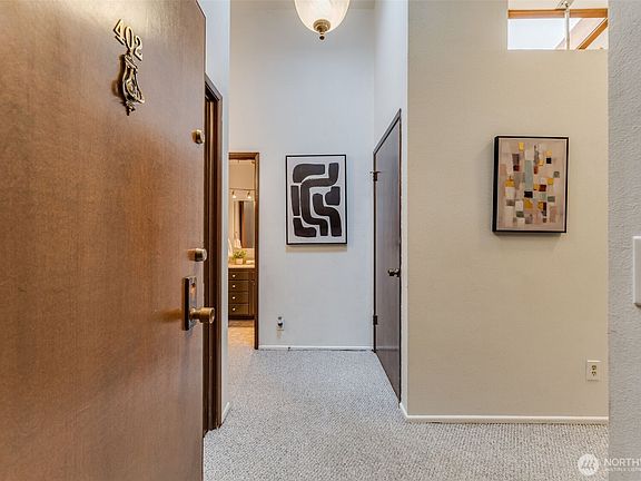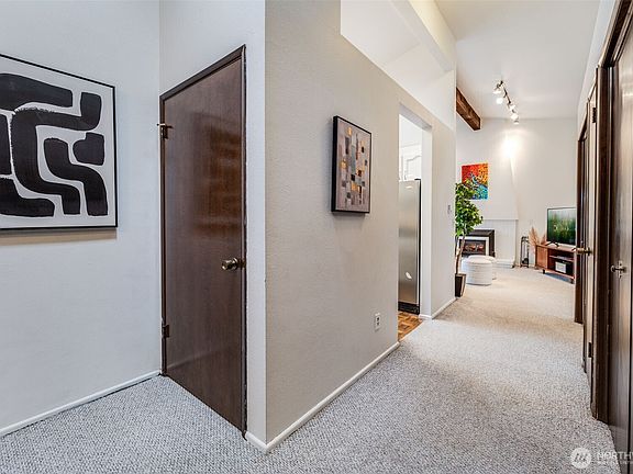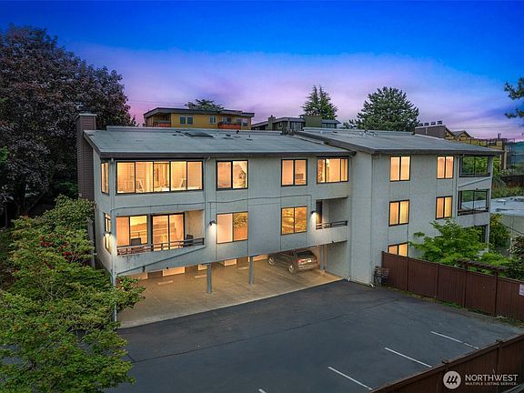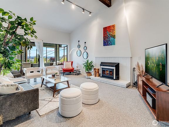 NEW LOWER PRICE! Urban living with lots of light, views & vaulted ceilings! A quiet top-floor 2 bed/1.75 bath condo w/1,100+ sq ft in Fremont. Wake up to mountain views & sunrise light, then stroll to coffee shops, parks, and local markets in Phinney Ridge, Ballard and Wallingford.14-ft ceilings, cozy wood-burning fireplace, wet bar, & 2 two encl. balconies make this the perfect spot to have fun and relax.Updated kitchen with stainless steel appl., including a brand-new dishwasher and spacious primary suite w/att. bath.Easy access, 2 parking spots, 2 additional private storage areas & shared rec room. 1.5 blocks from 5 & 44 bus stops. Hamilton Intern & Lincoln High sch.Strong HOA/low dues/Total 6 units.