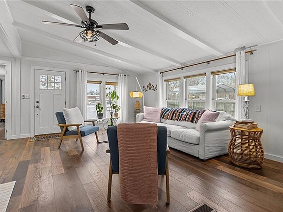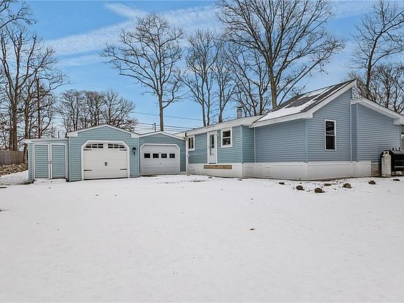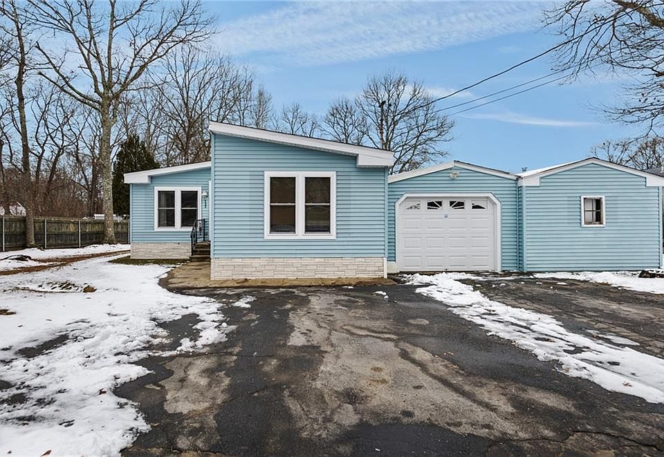 Spacious one-story manufactured home on beautifully landscaped half-acre lot in desirable Brayton Woods. Cathedral ceilings in living room with brick fireplace create an open, airy feel. Large kitchen flows to dining area, perfect for entertaining. Two bedrooms, two full baths; Washer/ dryer inside the home. Two attached garages plus workshop for hobbyists or extra storage. Convenient location; walk to Tiverton High School and Ranger School. Connected to municipal/town water, septic system, forced air heating. Move-in ready and full of character on 0.38 acres!
