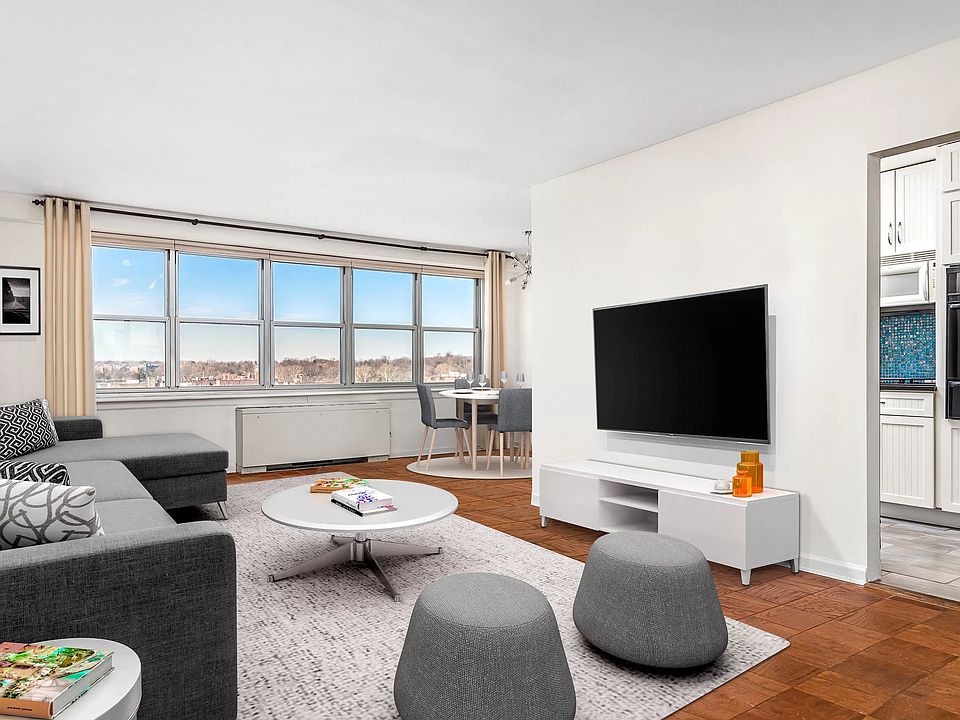 Seldom available high floor over-sized one-bedroom coop apartment that can be converted to a two. This apartment features panoramic, expansive treetop views of the horizon that include Coney Island, Verrazzano-Narrows Bridge, Sunset Park, and Downtown Manhattan. You will never tire of coming home to this paradise in the sky and will enjoy many breathtaking sunsets. The pass-through renovated kitchen opens to a large dining area with five enormous west-facing windows that flood this home with natural light. This apartment features what is probably the largest living room you will find in your search, a king-sized bedroom and four deep closets, including three double closets. Enjoy the comforts of central air, a 24-hour doorman, and stability and security in this well-run coop with excellent financials and a recently renovated laundry room. This is hands-down the best and most sought-after building on the Kensington / Windsor Terrace border, with a live-in Super, porters, and video security throughout. Short walk to the F/G train and walkable to the Q; express bus to the city in as little as 15 minutes. Prospect Park is your backyard. Run, bike, play tennis, or horseback ride. Enjoy concerts in the park or the bike trail to Coney Island at your doorstep. The neighborhood has great new coffee shops, restaurants, and quality food shops. Low maintenance includes cooking gas, heat, AC, hot water, RE taxes. Parking is waitlisted. Assessment of $18.50. No Dogs Sorry.