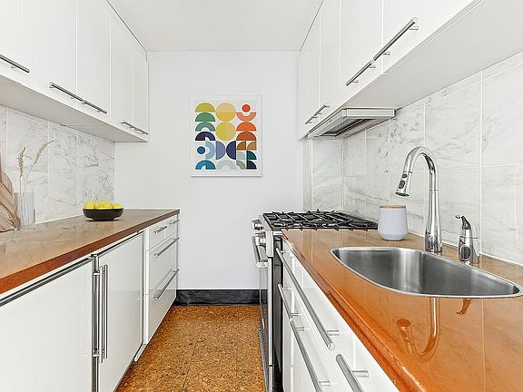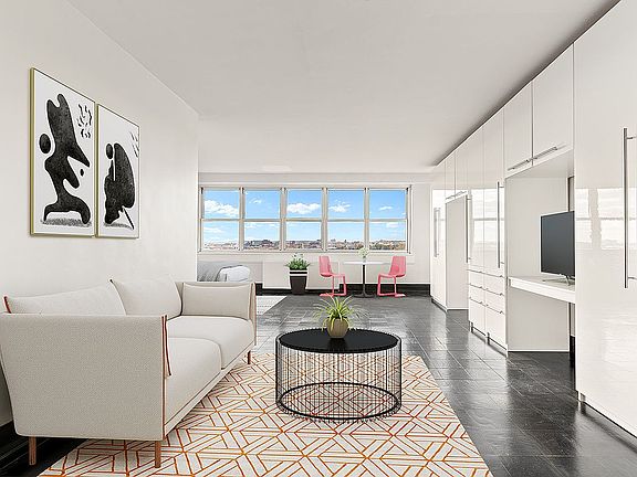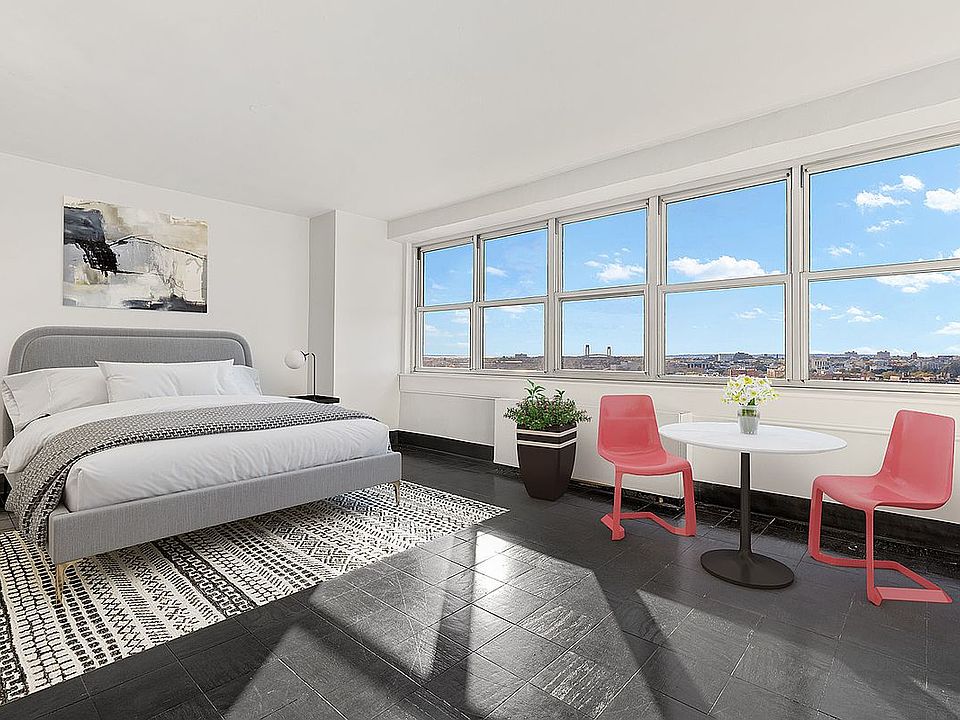 Spacious TOP-FLOOR alcove studio at Caton Towers. This bright and sunny home has approx. 550 s.f. of space, as large as many one bedroom apartments! This unique unit offers sweeping views from Coney Island to Downtown Manhattan from a 14' long bank of windows. Abundant natural light floods the space from your west-facing 17th floor perch, which highlights gorgeous sunsets and makes the unobstructed views truly awe-inspiring. Thoroughly renovated with espresso-stained hardwood floors, a wall of contemporary built-ins, and updated kitchen and bath. Plenty of room to live, sleep, dine and work! The thoughtful reno provides plentiful closet and storage space and two niches for media and a work-from-home setup. In addition, there is a separate walk-in closet fully outfitted with drawers, shelves, and hanging space, plus two additional closets. The chic kitchen features super-cool cork flooring, a high-end Blomberg gas range with KitchenAid retractable hood, and the undermount fridge and freezer allow for ample cabinet and counter space. Countertops are custom-designed and finished in a unique lustrous caramel color, and the bathroom features clean & crisp white marble tiles. 135 Ocean Parkway is an established and well-maintained full-service co-op that offers a large central laundry room, bike and storage rooms. Cats are welcome. Caton Towers is located at the nexus of Windsor Terrace and Kensington, providing easy access to Prospect Park, the Parade Grounds, several subway lines and express buses. Maintenance includes: heat, water, gas, and cooling in summer months - you pay electric only!