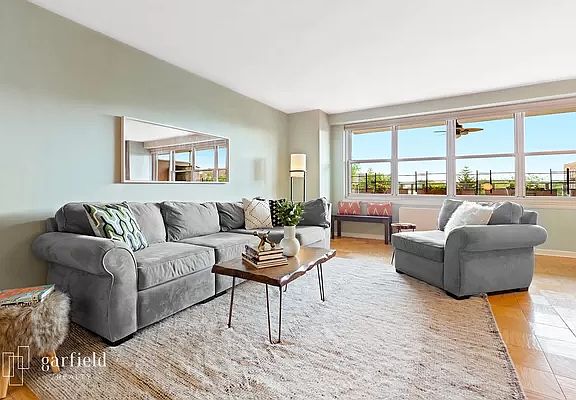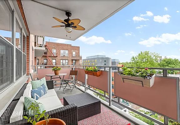This beautiful, sprawling, sun-filled home is perched on a high floor in a coveted full-service elevator/doorman building. A wall of windows illuminates an open, airy layout, and a large private terrace overlooks treetop views and serves as an extension of the comfortable and well-proportioned living/dining rooms. The modern kitchen features cherry wood cabinetry, abundant storage, stainless steel appliances, including a dishwasher and microwave, Corian countertops, and a tasteful tile backsplash. The king-sized bedroom in this thoughtfully designed home has been sub-divided into two comfortable bedrooms via a sliding door. The second space would make an ideal nursery or study. Additional features include HVAC units, an updated bathroom off the hallway featuring a luxe multi-jet Fresca rain shower, and incredible closet space, including an enormous walk-in. Caton Towers is located in the sweet spot of Kensington between Caton/Church Avenues on majestic Ocean Parkway, within walking distance to Prospect Park, Prospect Park Tennis Center, Kensington Stables, the Windsor Terrace Library, the F/G at Fort Hamilton Parkway, and plentiful dining options such as Hamilton's, Brancaccio's, Batata, Le Paddock, Thai Farm Kitchen, Der Pioneer, Church Cafe Wine Bar, Steeplechase, and more. Food Town and the Windsor Terrace Food Co-op are both within close proximity. Residents enjoy a full-time doorman, a landscaped front courtyard, common laundry facilities, a live-in super, storage, bike storage, and garage parking (waitlisted). Enjoy biking, rollerblading, or walking along Ocean Parkway's promenade, and in just 15-minutes, you can experience Coney Island and Brighton beaches and boardwalks. This is an amazing place to call home.