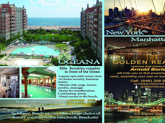 East Side-Ocean front building-Ocean front view,3 Bed, Double balcony Oceana Condominium-the best gated community in South Brooklyn with 24 hours security. Two outdoor swimming pools, one indoor swimming pool,gym,4 saunas, two steam rooms and private entrance to the beach. Kitchen with window. Stainless steel appliances and more. One parking spot included. Gas and water included in rent