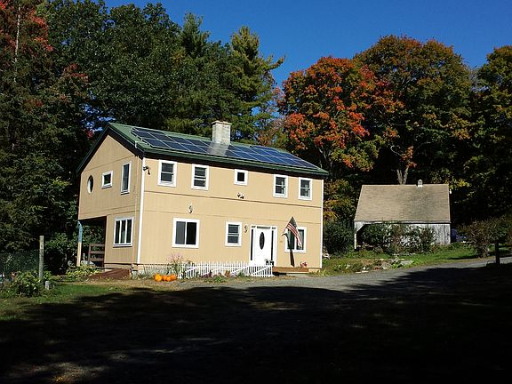 Spacious, Private, Convenient! Solar, energy efficient home has bedrooms and full bathrooms on both floors, with the master BR measuring 14x28. Forced air oil and wood system in the concrete floor basement. Barn w/2 horse stalls, water and electric, loft storage, paddock, a 60x120 riding arena. Detached garage has a wood stove, electric meter, 2 over sized bays and a large sunny loft. Directly across the street is Cadwell Memorial Forest with miles of hiking, skiing & horse trails with 1200 acres. 15 min to Amherst, 20 min to Rt 2 or Mass Pike.