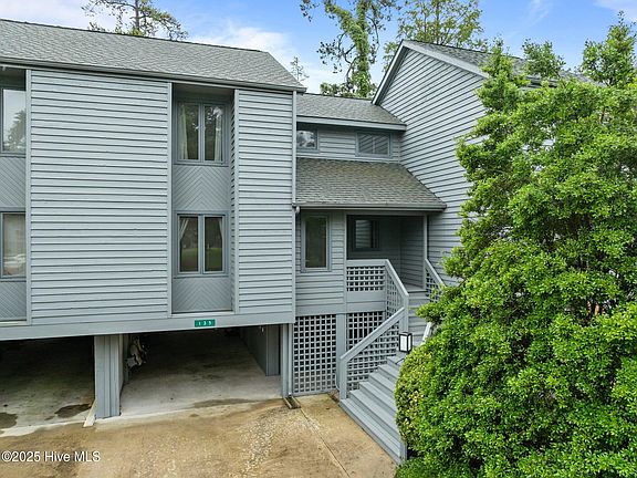 Water views of Broad Creek and the Pamlico River in the distance, from this 3 Bedroom, 2 ½ Bath townhome in Pamlico Plantation. The kitchen has new cabinets, granite counter tops and beautiful new tile flooring. Step out your back deck and onto a walkway to the clubhouse and marina where you will have a signed boat slip that will meet your needs. The master bedroom's bath has a nice tiled walk-in shower and a double vanity. Upstairs there are two bedrooms and a hall bathroom, with a bathtub/shower. One of the upstairs bedrooms has a corner that can be used as office space. There is a half bathroom located downstairs.The sunroom has tile floors, pull-down screens built in on the windows so you can let the breeze come through. The sunroom is separated from the main living areas by a ''glass folding wall'' that can be fully opened so that the sunroom becomes part of the main living area or closed for a separate space. On ground level, this townhome features a bonus room/workshop with tile floor, cabinets and a closet. A separate storage room that has lots of shelving. There's a covered patio on the water side and a carport with room for two cars (tandem). Storm-ready, this townhome includes a generator hook-up and a portable generator,