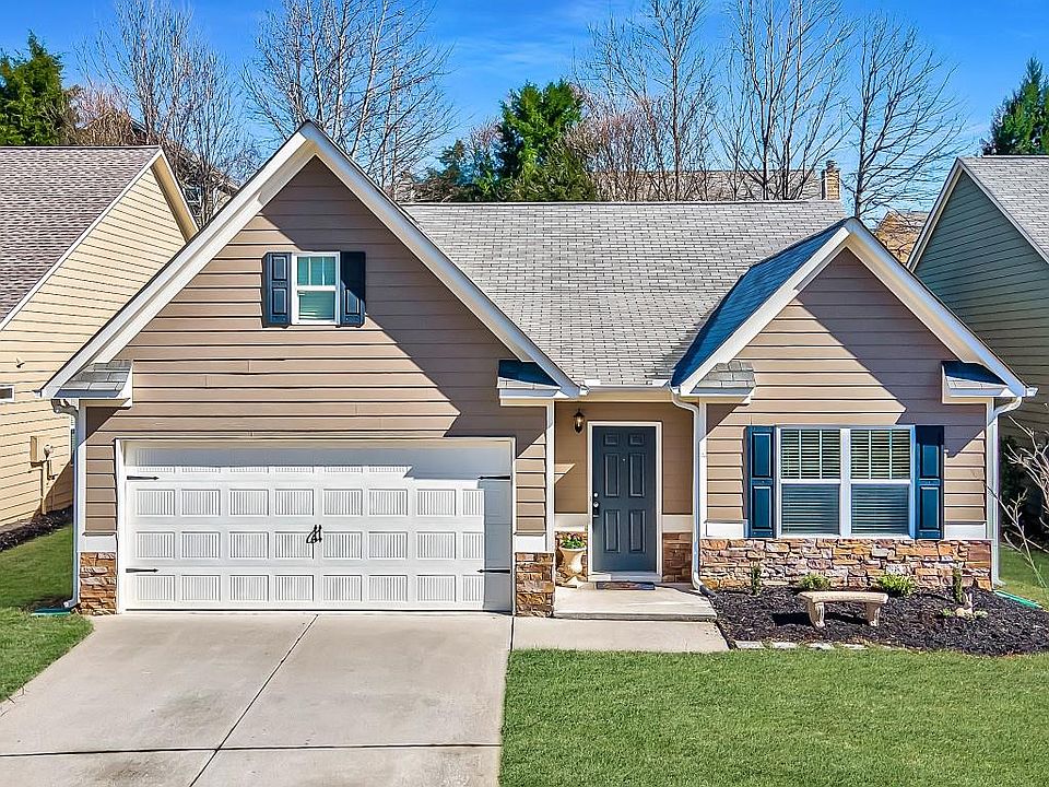 Bright, Move-In Ready Ranch! Enjoy the easy life at River Brooke in this Timeless Traditional. A Stepless Entry opens to a Hall Foyer. Hardwood Floors extend into a Large, Open Family Room with Fireplace. Gatherings flow effortlessly into a Heart-of-Home Kitchen with Granite Countertops, Walk-In Pantry, and Island Breakfast Bar. Through a Curved Archway, a Main-Level Owner's Suite delivers Vaulted Ceiling, Walk-In Closet, and Ensuite Bathroom featuring Soaking Tub and Separate Shower. Two Additional Bedrooms share a Hall Bathroom. Outside, a Rear Patio overlooks a Fully Fenced Backyard - perfect for pets or play! A 2-Car Garage welcomes you home. NEW HVAC (2022) with Premium UV Filtration, NEW Hot Water Heater, and Smart Lighting Upgrades installed. Soak up the sun with a Neighborhood Pool and Clubhouse. Minutes to Downtown Ball Ground, Rock Solid Brewery, and Feather's Edge Vineyards.