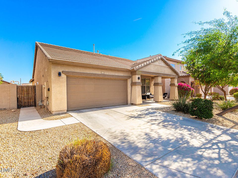 Elevate your single-level living in this spacious 3-bedroom, 2-bath home! Flaunting a lovely front yard with new gravel, 2-car garage, and a cozy front porch. You'll love the neutral interior, boasting with an open living/dining room, plantation shutters, tile flooring, high ceilings, and lots of natural light. The kitchen offers 2021 new SS appliances, rich wood cabinetry w/crown molding, ample counter space, breakfast bar, practical pantry, and a breakfast nook with bay window. Primary bedroom includes a full bathroom and sizable walk-in closet. The home's well maintained appearance extends outdoors to the incredible backyard ready for entertaining with a covered patio, artificial turf, large pavers and low maintenance landscaping. New Ceiling Fans, AC & Furnace installed 2021!
