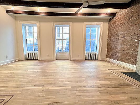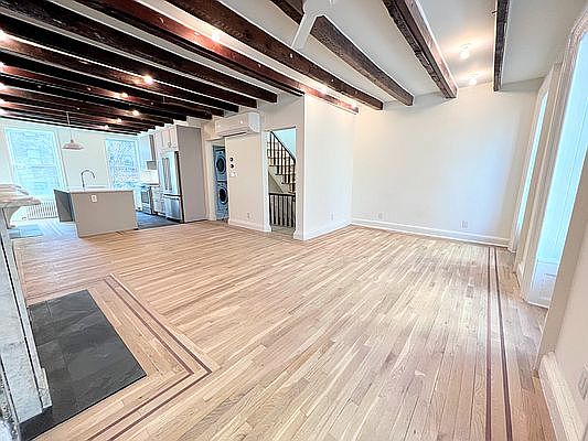Completely renovated 3 bedroom, 2 bath upper duplex that is still full of old-world charm. Exposed beams, original marble fireplace and oak floors throughout. All new plumbing, radiant heat and central air systems. Enter though the main entryway of the house into your own private foyer on the Parlor level. Proceed up the curving staircase to an open living space on the 2nd floor. A chef's kitchen is equipped with top of the line Bosch, Kitchen-Aid and Fisher Paykel appliances. A full bathroom houses a high-efficiency washer and dryer with built-in shelving and a deep soaking tub overlooking the garden. The top floor is flooded with light from 3 skylights and has 3 bedrooms, 2 walls of closets and a family-sized bathroom with a double vanity and oversized walk-in shower. Heat and hot water are included in the rent. Pets allowed with a pet-interview, and a pet lease rider. The 2-family Italianate style rowhouse is owner-occupied and sits on a 2-block long residential street across from Brooklyn landmarks: The Williamsburg Bank Clocktower, Brooklyn Academy Music and the Brooklyn Music School. Whole Foods and the Apple Store are around the corner. LIRR to JFK and 2345NQRBD is half a block away at Atlantic Terminal G train is 1 block away. C train is 3 blocks away.