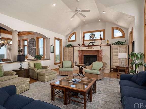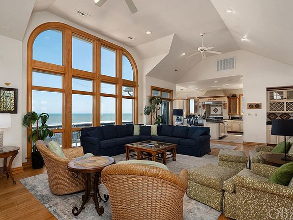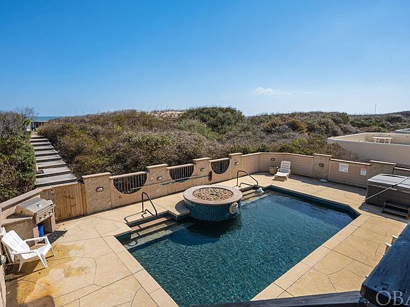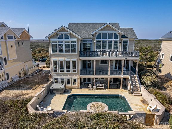 Breathtaking ocean and sound views surround this premium Pine Island home! This is a world class location with unmatched privacy. The nearest public access is 3 miles away creating a practically empty beach for you to enjoy. The premiere Outer Banks community of Pine Island offers easy access to the restaurants, boutiques and recreational opportunities in Corolla to the north and the town of Duck to the south. The top floor has uninterrupted site lines with large windows framing views of the ocean, beach and waves to the east, and the coastal saltmarsh, sound and bird sanctuary to the west. The kitchen, living room and dining room are open with cathedral ceilings and intricate architectural details. The gourmet kitchen is clad with premium finishes including custom tile, distinctive cabinets, dazzling granite countertops and casual bar seating for three. A host of stainless steel appliances include a sub-zero refrigerator, 6-burner cooktop, double ovens, two warming drawers, two microwaves, two dishwashers, and an ocean view breakfast nook with a stylish table for four. The midlevel has 3 private and spacious bedroom suites. The two on the oceanfront offer king beds, ocean views and covered deck access. The one facing the sound has lovely sunset views. The ground floor has a fourth king suite and two other bedrooms sharing a full bath. One has two queens and the other has a twin bunk-set with a trundle. There is also a laundry room with two washers and dryers on this level. The theater room is spacious and is a crowd pleaser with a wet bar, raised bar and platform seating. The game room with pool table opens up to the custom pool and outdoor living area. The custom concrete pool is spacious and stylish with a beautiful planter and fountain. The private dune walk, hot tub, two outdoor showers complete the fun! Guests love this home and it is on track to achieve over $250,000 in rent for 2023!
