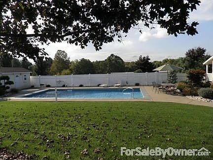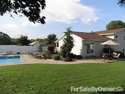 A Resort Style Residence situated on approximately one level acre of meticulously landscaped grounds. Why go away when you can enjoy a casual lifestyle here. Enjoy outdoor entertaining around the swimming pool and then go relax on the private patio. Plenty of room in the 18 X 36 pool that has an automatic pool cover. It takes only a minute to open and close the pool with the turn of a key. Pool house is great for storing equipment and comes with a private room for changing. After dark the grounds are illuminated with professional grade landscape lighting that adds to the homes presentation and curb appeal. The home is in a neighborhood close to town and school but private too. This well maintained home features ceramic tile in the baths and kitchen with a gleaming dining room hardwood floor and new roof in 2010. Pella windows, french door, sliding door and beautiful six panel doors thoughout. Custom Bali 2 1/2 inch blinds on all windows. Relax in the lower level den near the stone fireplace. Your pets can run the entire property with the security of an Invisible Fence installed around its perimeter. Basement includes Front Load Washer and Dryer with warranty, Refrigerator, 220 outlet for additonal Range and an 8' Brunswick (Brookstone) pool table. Additional property info: http://www.forsalebyowner.com/listing/8F203?provider_id=28079