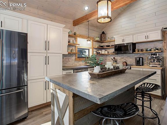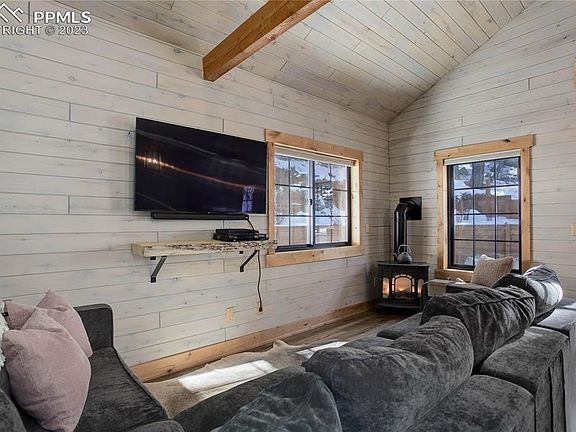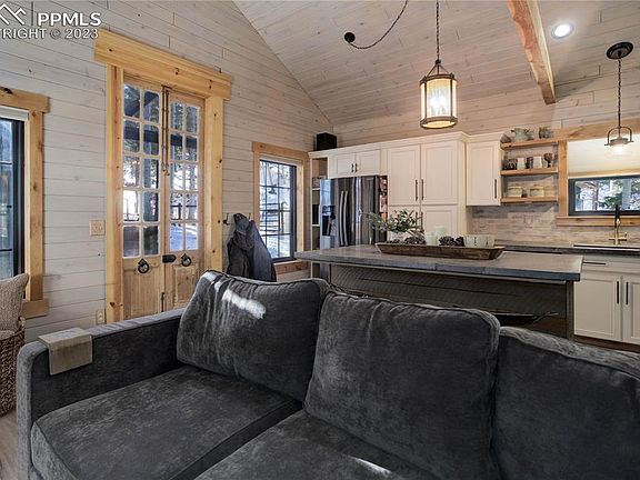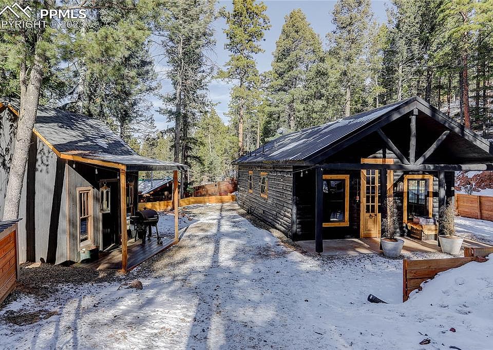Escape to serenity in this charming ranch-style cabin nestled in a picturesque valley just south of Woodland Park. This inviting retreat, surrounded by a canopy of aspens and conifers, offers a brilliant combination of rustic charm and modern comfort. The covered front porch and log exterior portray a wonderful rendition of a Colorado mountain retreat. The vaulted ceiling and windows bring ample lighting to the great room, adorned with exquisite wood detailing. Revel in the warmth of the propane free-standing stove while enjoying the ambiance of antique glazed cabinets and concrete counters in the kitchen. Recent upgrades, including new windows and floors, seamlessly blend contemporary convenience with the cabin's timeless allure. Privacy is paramount with a fully fenced yard, creating a tranquil haven. A 144 SqFt finished studio-shed, equipped with heat and electricity, provides the perfect space for hobbies or quiet moments. With recent updates such as a newer roof and kitchen cabinets, this move-in-ready haven beckons those seeking a relaxing mountain escape. Explore nearby hiking trails, fishing spots, boating areas, and ATV adventures – this property is an invitation to experience the tranquil appeal of Woodland Park's natural splendor.