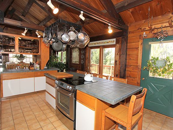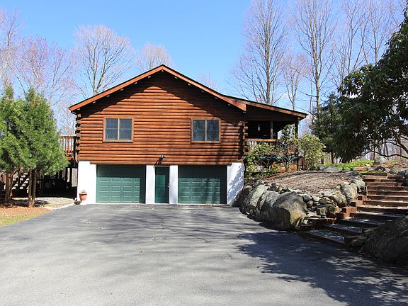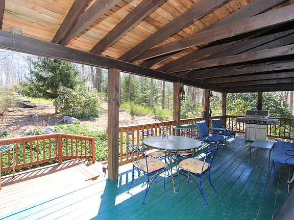 PURE AND PRIVATE! This warm and inviting 'get-away-from-it-all' 3 bedroom home is built extremely solid in log cabin fashion and offers many unique features...6 acres of private, park-like property loaded with lovely rock formations, koi ponds and a custom 3-par golf hole with tee, fairway and green! Current owner is only the 2nd and cherishes the 'life off the grid' feeling every day after work's hustle & bustle. High ceilings accented by solid wood beams, a row of fans and track lighting. Beautiful kitchen w/ center island and sliding glass door to huge deck overlooking amazing backyard. Nature and gorgeous views abound. Incredible wood work and hardwood floors add to the rustic feel. Central AC. Finished basement accented by a custom bar, half bath and entry into a 3-car garage. Comforting front porch for so many possibilities. Only 1 hour from NYC, minutes to all else including hwys/train. So quiet. Life in YOUR control. Coming home here will always make you feel it's all worth it!