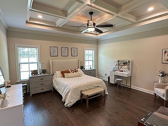 - Ceiling Features: Coffered, High, Crown Moldings, Trey/Box