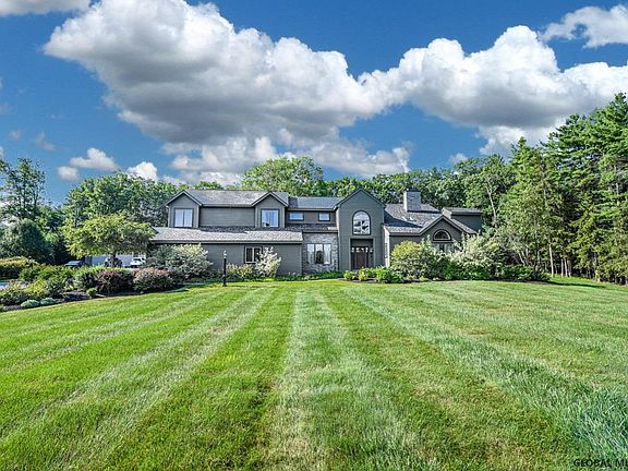 Nestled at the end of a picturesque driveway adorned with soaring weeping willows you'll find the exquisite craftsmanship of this custom 5BR, 4 1/2 bath Voorheesvile home. The main house showcases architectural detail w/custom moldings, vaulted angles & soaring windows throughout. Gourmet chefs kitchen boasts professional grade appliances & large sitting area. Other features include beautiful double sided stone gas fireplace, huge pantry/mud room, 2 spacious master suites, finished basement w/full bath & so much more! Enjoy tranquil mornings & relaxing evenings from the Adirondack sleeping porch w/luxury Ipe decking, large screens, & out door TV. The detached garage is a mechanics dream w/ 13 Ft ceilings & re-enforced concrete for car lift. PLUS adtl 1000 Sq foot AuPair Suite w/Full Bath!