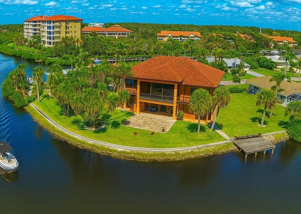 Retreat to paradise in this stunning waterfront home, built new in 2011, in highly sought-after Sorrento Shores, Osprey. Perfectly situated on 210 feet of wide canal frontage, this residence offers deep water access with no bridges to the bay—a dream for boaters. Nearly every room provides breathtaking views of the water and swaying palms. Constructed with concrete block on both floors and encompassing 6,254 square feet under roof, this home was built for strength, safety, and peace of mind. The main living area is elevated to 18 feet, well above flood levels. Inside, you’ll find an open-concept design with soaring 14-foot coffered ceilings, crown molding, and LED lighting. Expansive sliders lead to a private lanai and wraparound balconies to enjoy serene sunrises and glowing sunsets. The kitchen offers a large granite island, ample counter space, and a gallery window framing the water. Each of the three bedrooms features a private ensuite bathroom. The master suite includes three closets, balcony access, and a spa-like bath with jetted tub, dual vanities, makeup desk, and oversized shower. One secondary bedroom also has balcony access. The first level provides space for cars, toys, and storage with hurricane-impact glass throughout. Closed-cell insulation enhances efficiency, and concrete stairs and elevator shaft add durability. The home sustained no damage or flooding during recent hurricanes. The expansive paved patio overlooks canals frequented by manatees and dolphins.