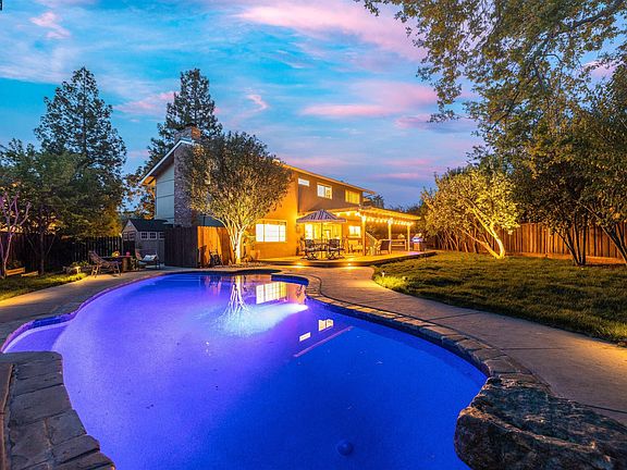 Welcome to your dream home! This classic craftsman style two-story home boasts 2,650 square feet of living space, featuring 5 spacious bedrooms and 2 1/2 bathrooms. The home is complemented with 2 cozy fireplaces, adding warmth and comfort on chilly nights. Hardwood flooring and LVP, gourmet kitchen w SS appliances and island cafe counter. Elegant Living and Dining Rooms separated by a grand entry. Large primary bdrm w fireplace, walk-in closet, updated bath w skylight, luxurious shower and radiant heat floor. The huge 5th bedroom with walk-in closet, wet bar & drink refrig provides endless possibilities for an office, game room, media room and more. Exterior stairway leads to balcony & back yard play court area great for sports enthusiasts. Step outside and enjoy the .24 acre lot complete with a beautiful PebbleTec pool featuring sun shelf, solar heat. Huge trex decking for outside dining, BBQs and lounging. Garden beds, tufted grass, fruit trees, sport court area and more. A perfect home for entertaining large or small groups or enjoying private time. This house is a must-see for those looking for luxury and comfort in a home.