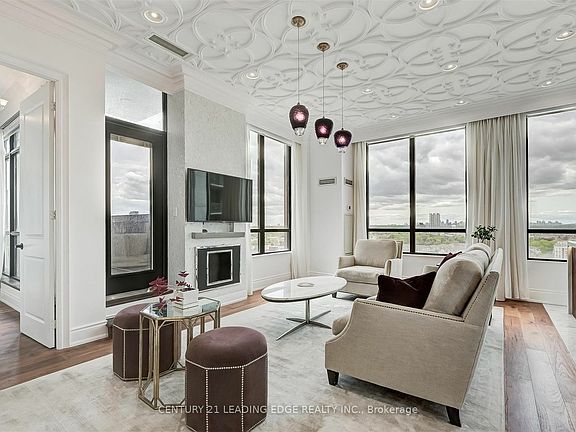 Rare Elegant Luxury Upgraded Corner Penthouse Suite w/ Three Views, In The Heart Of It All. Total 1510 Sqft W/Terrace & Balcony, 1274 Sqft Unit Plus 160 Sqft Open Terrace, plus 80 sq.ft Covered Balcony W/3 Separate Walkouts, 10 Ft Plaster Ceilings Throughout with 11ft Ceiling in Front Foyer . Amazing Views Facing Morning Sunrise in the East, CN Tower Downtown Views And Incredible Breathtaking Sunsets. Open Concept W/Huge Kitchen Island & Tons Of Cabinets, White Marble throughout the kitchen, Liv Rm fireplace wall and Floor to Ceiling in bathrooms. 2 Side By Side Parking & Locker Near Elevator, Huge Floor to Ceiling Windows, Great Foyer, Shows Like A Model Home and Feels Like a House. On and Off the DVP within seconds, nice and quick for getting around.