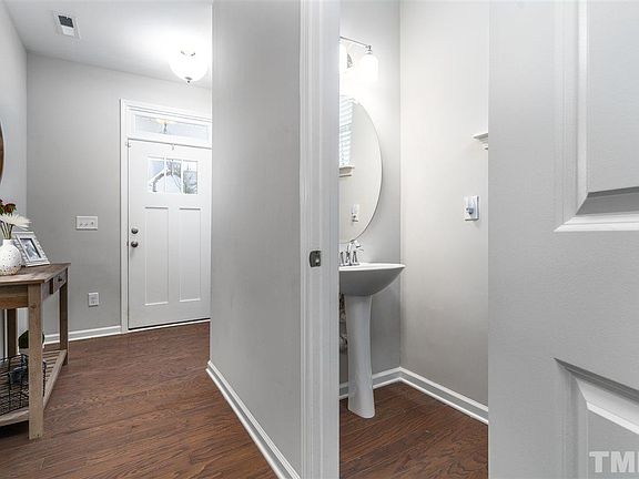 MOVE IN READY End Unit Backs to tree line. Beautiful Hardwood Flooring First Floor. Kitchen w/Granite Countertops, Custom Cabinets, Center Island w/Breakfast Bar & Pendant Lights, Tile Backsplash, SS Appliances, Recessed Lights, Pantry. Family Room w/Designer Ceiling Fan w/Light. Master Bedroom w/Trey Ceiling Crown Molding, Carpet, Double Window, Ceiling Fan w/Light. Master Bath w/tile Floors, Dual Vanity & large shower. HUGE Walk In Closet. Patio and storage. Located in the RTP Lovely community pool!