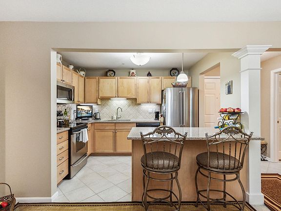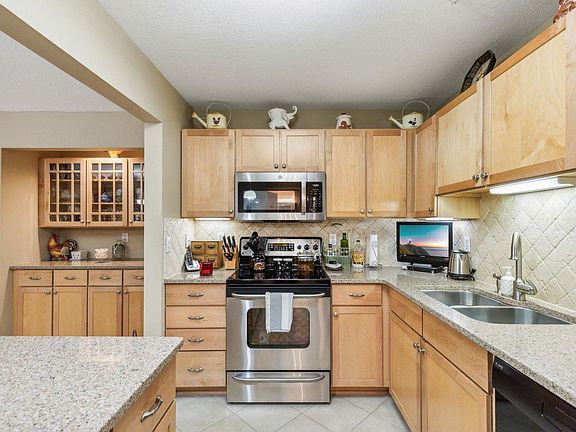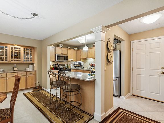 Fabulous one-level living at Villa on Bassett Creek! This gorgeous unit is the largest floorplan in the complex with two ensuite bedrooms/bathrooms and a 3rd bedroom/office/den. Beautiful kitchen with Silestone counters, stone backsplash, stainless appliances, maple cabinets, and matching dining room buffet. Total owner’s bath remodel features dual seamless sinks, additional matching built-ins, and spacious walk-in shower. Delightful screen porch provides a peaceful view of the pond, flower gardens, and the creek. Thoughtful updates include new A/C, furnace, water heater, refrigerator, dryer, light fixtures, cabinetry hardware, and new paint throughout. Two parking stalls and storage locker are included with unit.